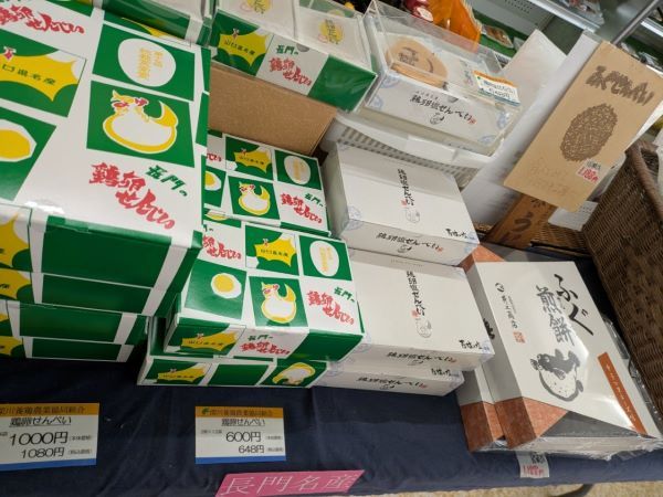 お酒のお供も販売しているこちらのお店。時代のニーズに伴って、生鮮食品を始め食料品も扱うコンビニのような役割も果たしているそうです。玉子の味わいとパリッと感がおいしい「鶏卵せんべい」は大人気です。
