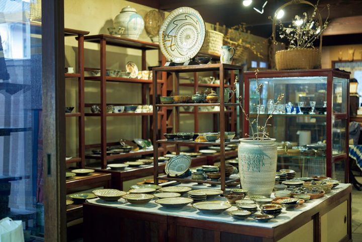 大分の小鹿田焼や沖縄のやちむんが並ぶ店内。