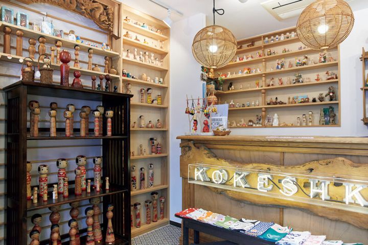 こけしは東北のものを中心に、古いものから新しいものまでさまざま。こけしをモチーフにした手ぬぐいやボールペンなどのグッズも。