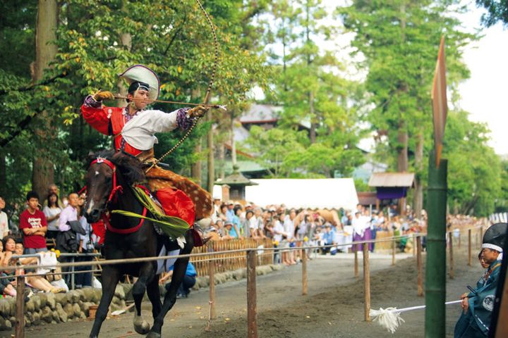 「流鏑馬(やぶさめ)」は武者姿の射手が馬上から的を射抜く伝統神事。
