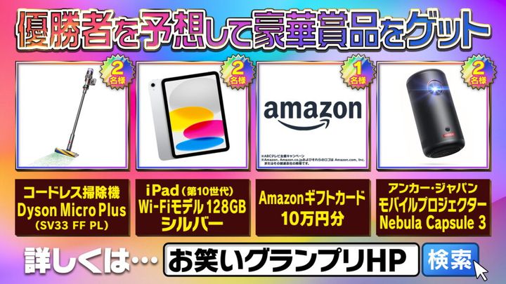 また、今年も優勝者予想キャンペーンを開催することが決定!「第46回 ABCお笑いグランプリ2025」番組ホームページ上の応募フォームにて優勝者を選択し、必要項目を入力すると応募完了となる。的中した方の中から、抽選で下記の豪華賞品をプレゼント。応募期間は6月18日(水)から6月29日(日)の決勝当日、ファイナルステージに進出する3組が決定するまでとなる。詳しくは「お笑いグランプリHP」で検索。