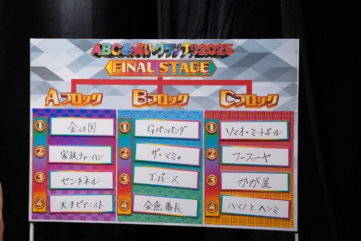また、今回の会見では決勝のブロック分けをこの場で決める初の試みも。ステージには、決勝進出者の名前が書かれた12個のボールが入ったボックスが登場。この中から山里がひとつずつボールを引いていき、引き当てた順に出場者はA・B・Cのどのブロックに入り、どのライバルと戦いたいかを選ぶことができる。