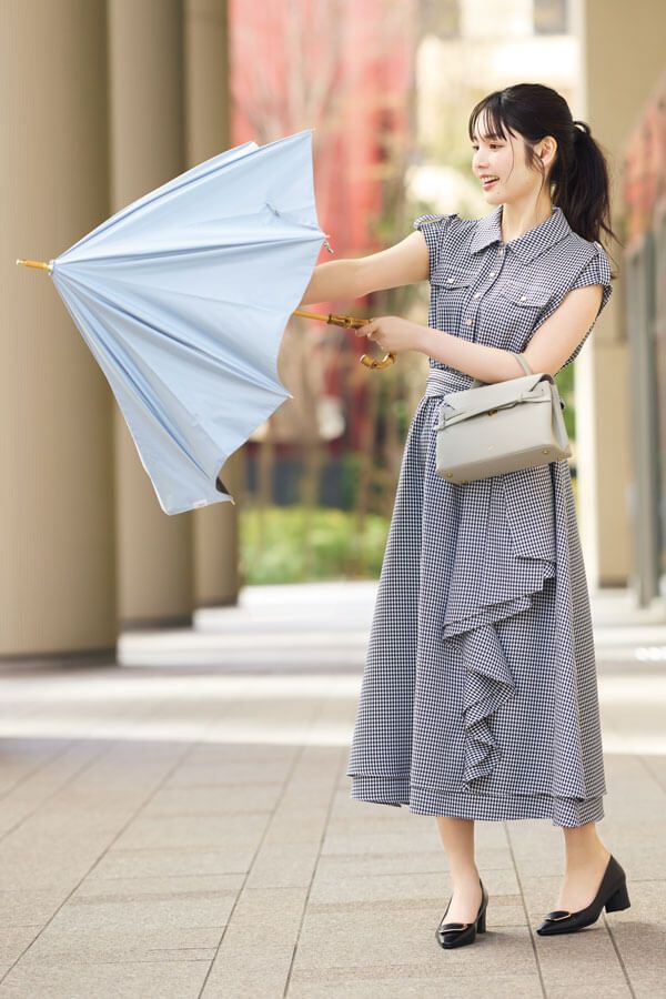 30℃を超える日は1枚でさらりと着られるワンピについ手が伸びる♡ 涼しげブルーの日傘で紫外線も万全に! 横からの日差しもしっかりカバーしてくれる大きめサイズ&深張りタイプが安心です。