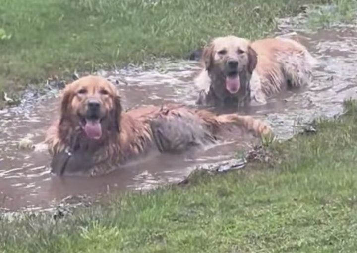 これは帰ったら即お風呂! 泥水に入ってまったりする犬さん。