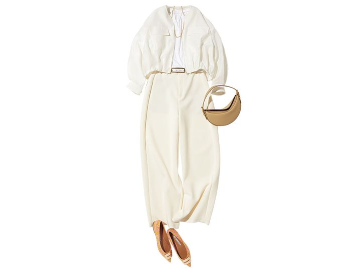 ブラウス¥29,700(DES PRÉS/DES PRÉS)パンツ¥33,000(LE PHIL)バッグ¥99,000(J&M デヴィッドソン/J&M デヴィッドソン カスタマーセンター)フラットシューズ¥82,500(ペリーコ/アマン)ベルト¥15,400(LEFIJE/TOMORROWLAND)ネックレス¥272,800(ウノアエレ/ウノアエレ ジャパン)