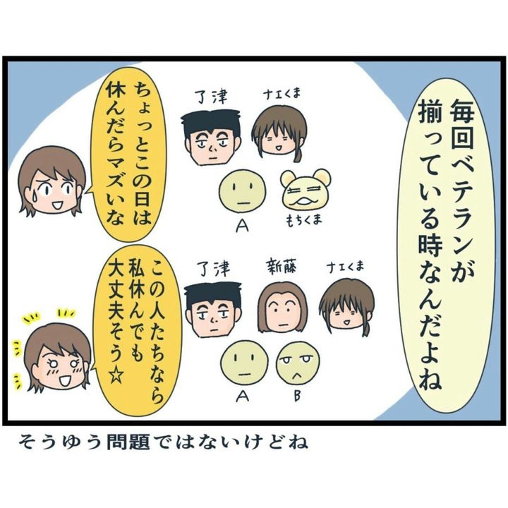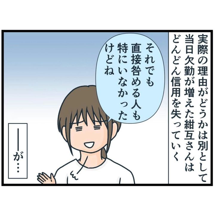 紺互さんの当日欠勤が続くようになり、同じ職場で働く人たちからは「本当の理由はデートだ」と言われるように。ついにはドタキャン欠勤したことについて、紺互さんは嫌味を言われるようになります。こうなると職場の雰囲気はどんどん悪くなってしまいますよね。