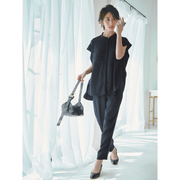 サイドスリット入りのブラウスは アウトして風通し良く着こなせる。 同素材のイージーパンツで楽ちんキレイ