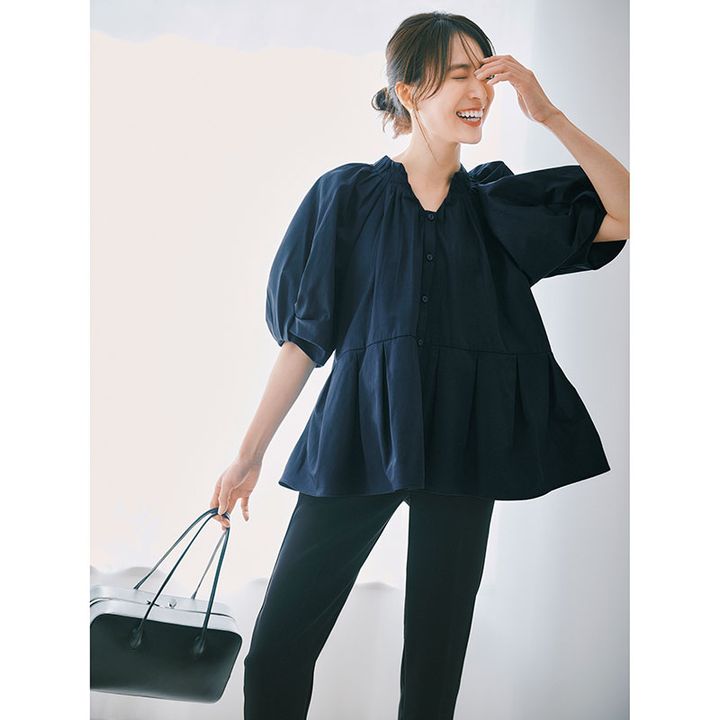 タック入りの立体ブラウスは 細身パンツに合わせてメリハリUP。 五分袖で気になる二の腕カバーも