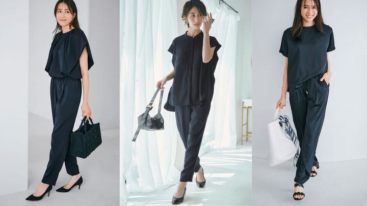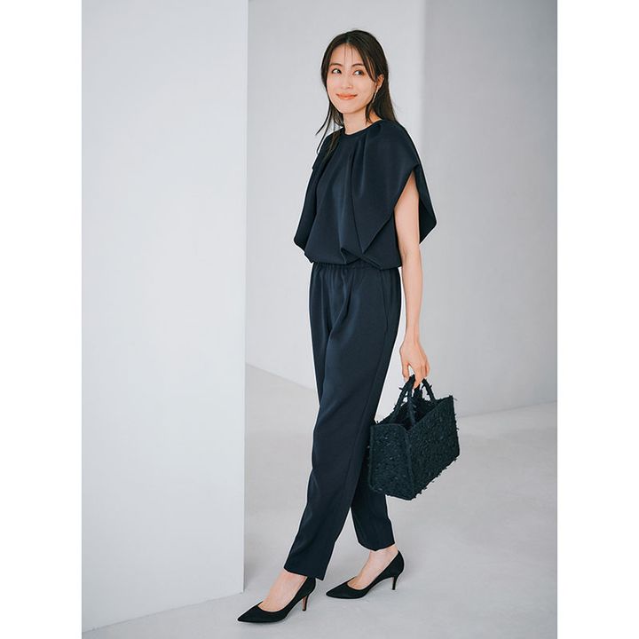 全身ネイビーの母業シーンも オールインワンなら今どきオシャレに。 立体袖で二の腕カバーも