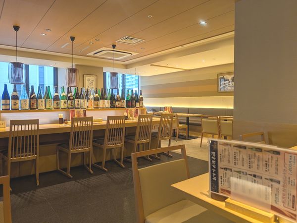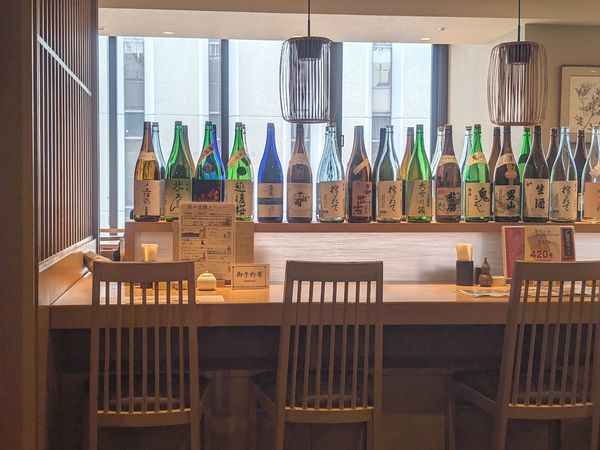 テーブル席は座り心地の良いソファ、カウンター席の目の前には日本酒がたくさんありました。おひとりさまでもゆっくりと過ごせるような空間でしたよ。静かすぎず賑やかすぎず、ちょうど良いぐらいの居心地の良さ。常連さんが多いのもわかります。