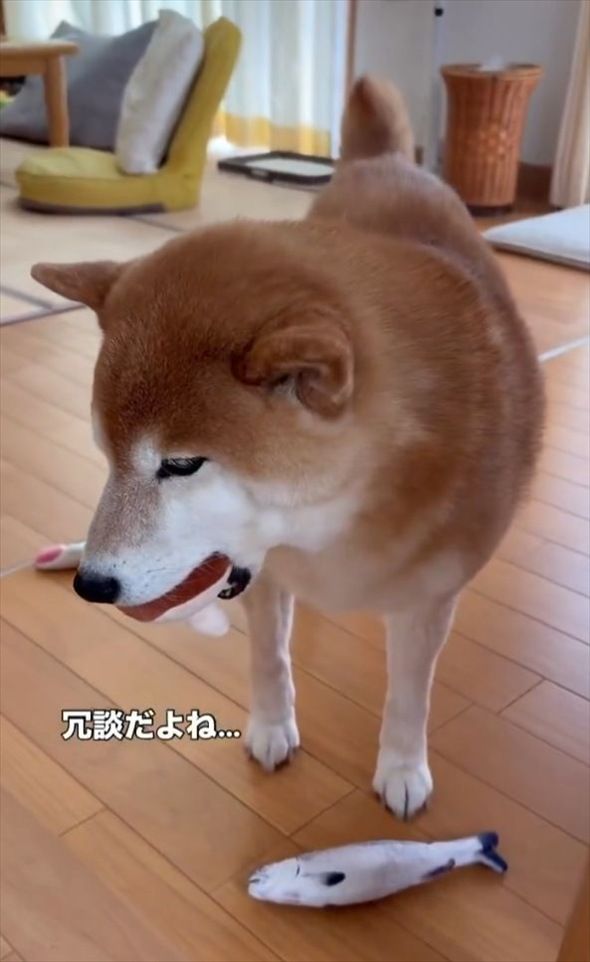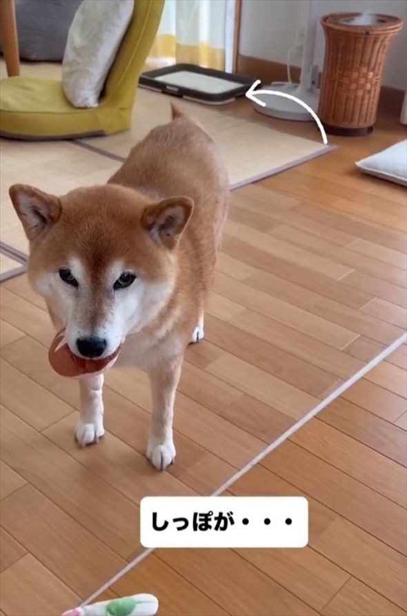 しいたけのオモチャをくわえているのは、柴犬の『すず』ちゃん。 飼い主さんに遊ぼうとアピールしているみたい。
