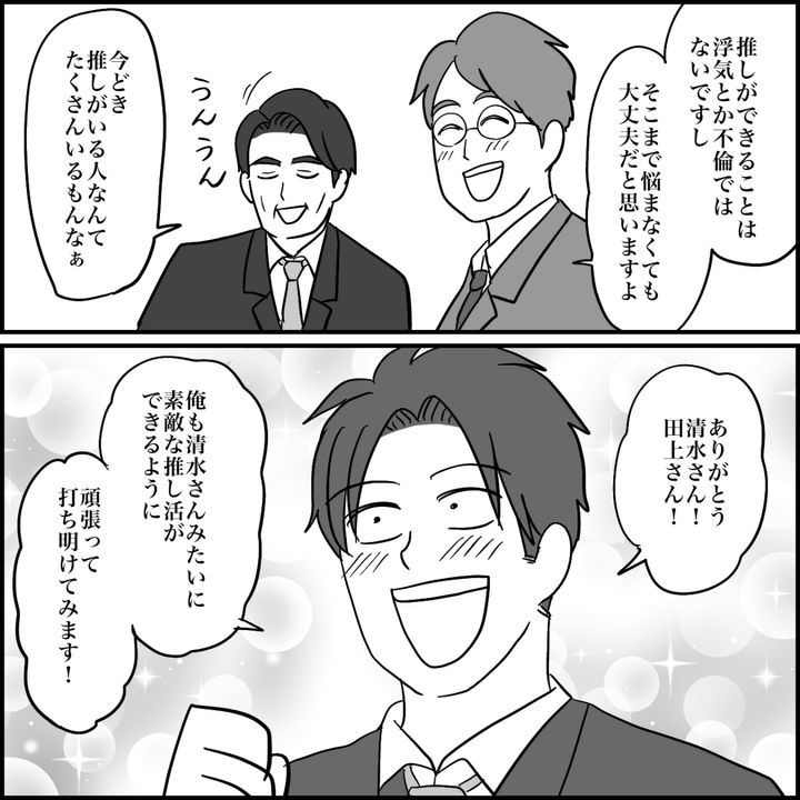 俺は井上コウタロウ(40歳)。妻のミサト(35歳)と2人の子どもたちとの4人家族です。このたび40歳にして初めて推しができました! ライブを前列で観るためには子連れが条件です。でも息子を連れていくためには妻のミサトに打ち明けなければなりません。ドルオタの同僚・田上さんに話したところ、家族そろって推し活をしている清水さん(40歳)を紹介してくれました。俺はミサトへの切り出し方を相談してみたのです。