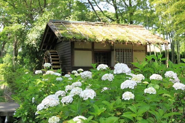 府中市内から8棟の歴史的建物が復元されて移築されており、あじさいの花とともに大正時代の町役場や江戸時代の茅葺屋根の民家を眺めるのも楽しみです。懐かしいような、温かみがあるような、独特な風情を演出してくれます。