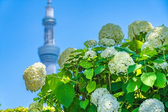 広さは、墨田区側の左岸は向島1、2、5丁目の面積約8万平方メートルを誇り、公園内の日本庭園は水戸徳川邸内の池等、遺構を利用して造られています。公園内からはスカイツリーの姿も。アジサイとともに絵になる風景をつくりあげています。雨の日に見る光景もまた違った美しさがありそうです。