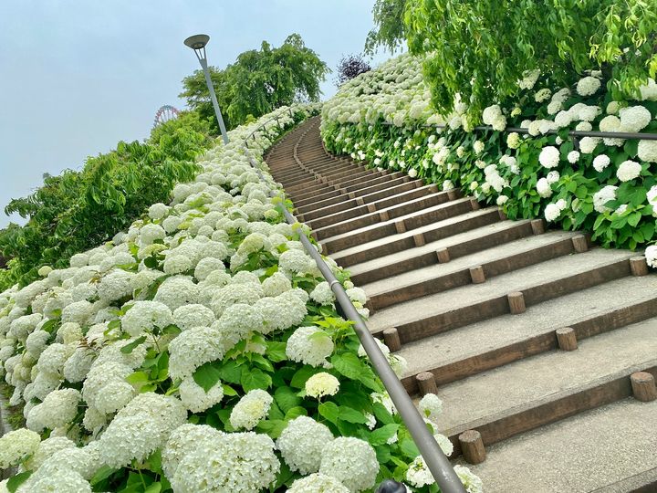 お台場には、まだ広くは知られていない穴場的なあじさいスポットが4カ所も。Hydrangea Stairs あじさいの階段(シンボルプロムナード公園)では、カーブを描く階段の両側を彩る見事な白いアナベルが見られます。