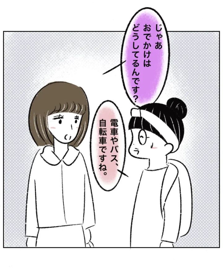 ゆかちゃんママの質問はまだまだ止まりません。「じゃあおでかけはどうしてるんです?」と聞かれ、「電車やバス、自転車ですね」と律儀に答えるまるさん。