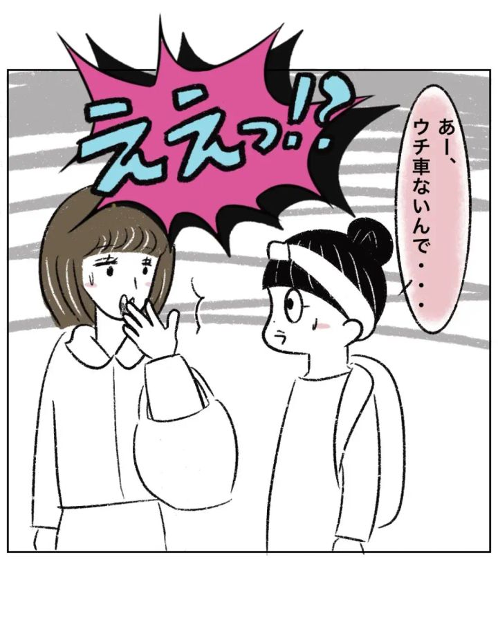 「あー、ウチ車ないんで・・」とまるさんが答えると、ゆかちゃんママは「えぇっ!?」と大げさに驚き、