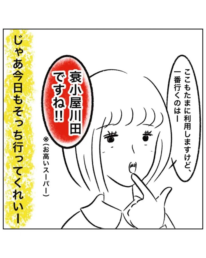 まるさんがいつも利用しているスーパーに強引についてきたゆかちゃんママは「いつもは衰小屋川田ですね!」と高級スーパーの名前を出しました。
