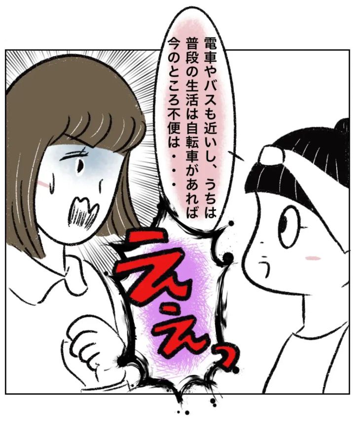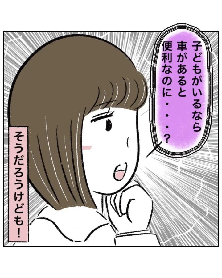 「子どもがいるなら車があると便利なのに・・?」と車はあって当然といわんばかりのゆかちゃんママ。まるさんは反論する気にもなれず「そうだろうけども!」と心の中で突っ込みました。