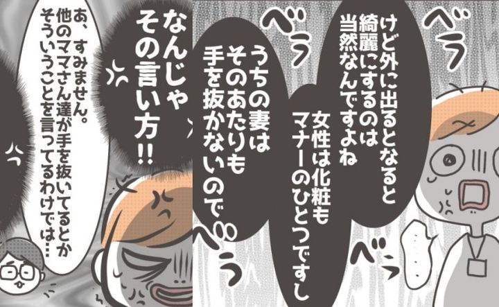 「すーちゃんママさん、すごくおキレイですね」と伝えると「はい。当たり前です」と前のめりで返事をされてしまいます。さらに「外に出るときはキレイにするのは当然」「女性は化粧もマナーの1つ」「うちの妻はその辺りも手を抜かないので」とまくし立てられます。