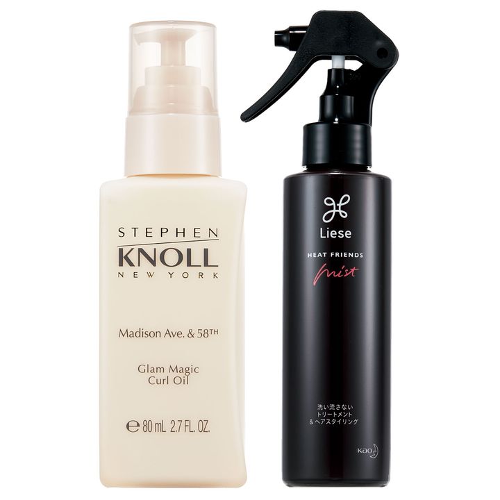 左から:スティーブンノル マディソン58 グラムマジック カールオイル80㎖¥1,980〈編集部調べ〉(スティーブンノル)【こちらを使用】リーゼ 熱を味方にするミスト150㎖¥1,188〈編集部調べ〉(花王)