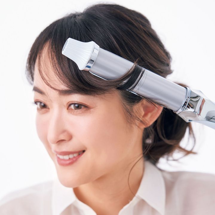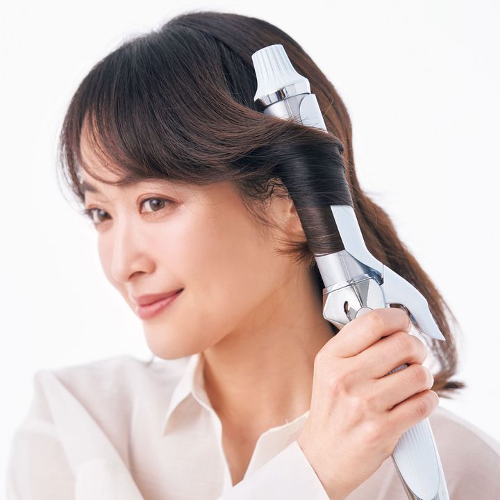 やや太めの32㎜のコテは、全体をミックス巻きにするのにも顔周りの髪を巻くのにもちょうどよい。リファカールアイロン プロ32 ホワイト¥25,000(MTG)