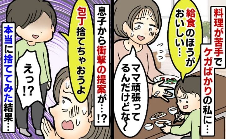 心身ともに限界でしたが、息子を責めるわけにもいかないので「え~! ママ頑張ってるんだけどなっ」と笑顔を見せて、強がっていました。そんな私に息子が「ママの手が切れちゃうから、包丁は捨てちゃおうよ」とまさかの提案をしてきます。「そうか……。包丁を捨てれば……」と息子のひと言にハッとした私。これまで料理本やネットレシピに頼っていましたが、「きちんとしなくては」という思いから、時短レシピには手を出していませんでした。