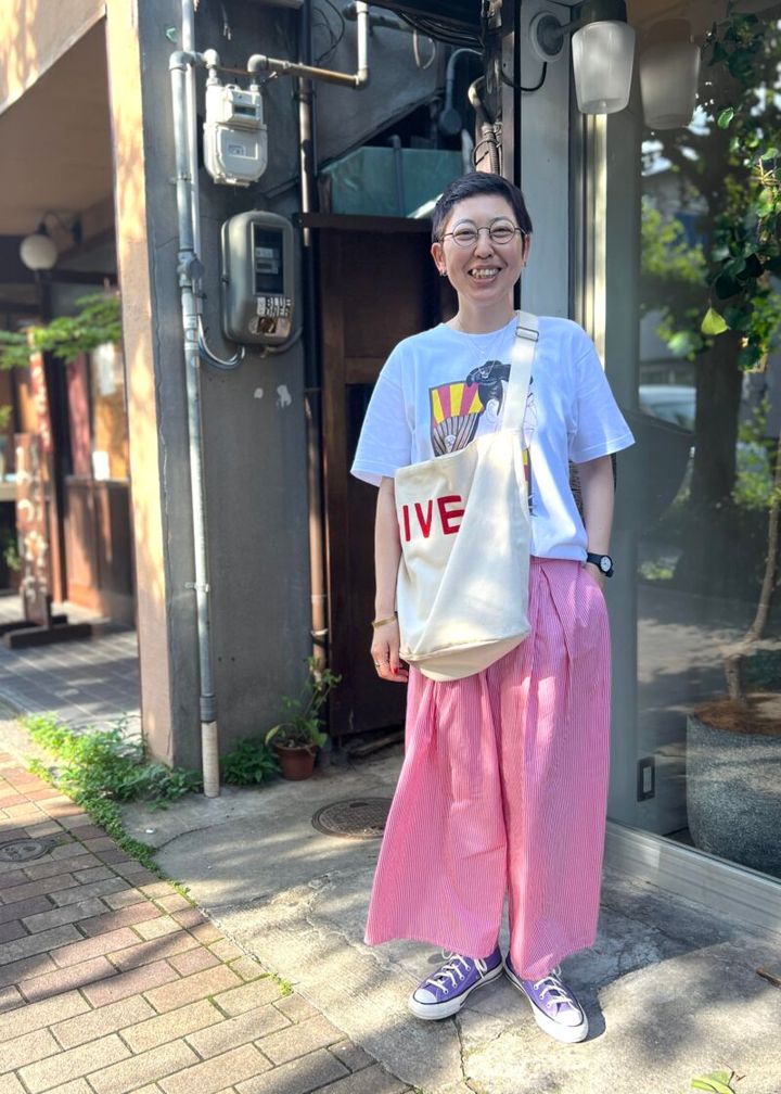 ウエスト周りのタック使いが気になるボトムスは、ザラのオールインワンの古着を自分でリメイクしたという赤のストライプパンツ。ポップな色遊びが上手なデザイナーのヤマモトチカさん。「今日は古巣の京都で久しぶりに、トートバッグの受注会をしています」。「無意識ですが、肌のくすみを補っているのか、自然と明るい色を選ぶようになったかもしれませんね」。夏の始まりのような日に、ベリーショート&カラフルな着こなしが印象的!