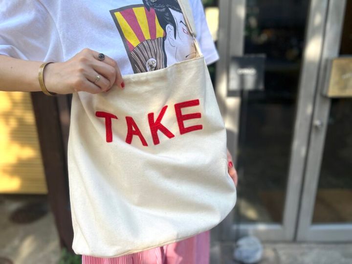 自身のブランド「チカヤマモト」の「GIVE and TAKE」ショルダーバッグは、ベースのキャンバス地と文字の色の組み合わせがオーダー可能。「京都は自転車に乗る人が多いので、トートとショルダーを行ったり来たりしながら迷う人が多いですね」。右手指につけた天然石のリングは、京都の「フリュイジョリー」で。「とても気に入っていて、誕生日にひとつずつ買い求めるのを楽しみにしています」。
