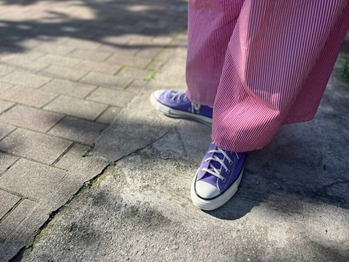 赤のストライプパンツに、コンバースオールスターのハイカット。「色が好きなので、カラーリングを楽しむコーディネイトが多いです」とチカさん。ちなみに、靴下は赤!