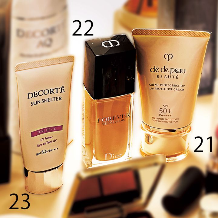 21どんな時でも持ち歩く、一番信頼しているUV。スキンケアしながら肌を紫外線から守るクレポ クレームUV n。22キチンと感が続く。ディオールスキン フォーエヴァー フルイド グロウ 1.5Nは明るく均一な肌色になり光であらも飛ばしてくれます。23紫外線をガードしながらトーンアップ。デコルテのサンシェルター マルチ プロテクション トーンアップCC 10はカバー力もあるからこれだけで外出可能。