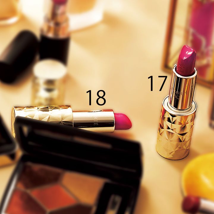 17、18疲れで顔がどんよりしたときに欠かせない。唇を鮮やかに染めて顔色を明るくするコスデコのAQ リップスティック01、華やぎも増す03。ママ友ランチや美STの撮影時に使用。