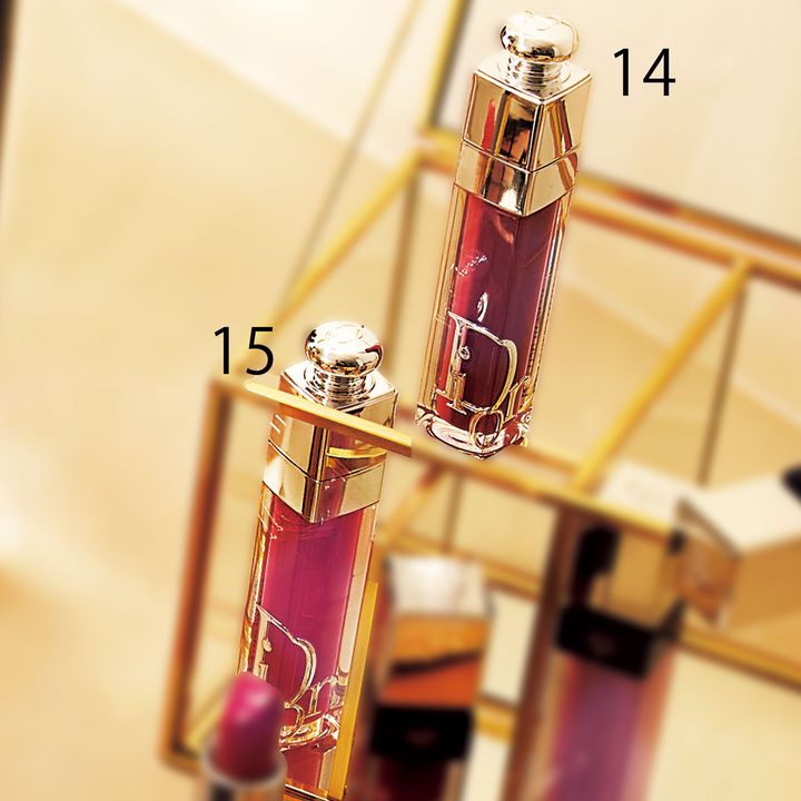 14、15ボリュームアップする高発色リップで華やかに。スーっとする使用感がたまらないディオール アディクト リップ マキシマイザー 024は落ち着いたレッド系、007は鮮やかピンク系。