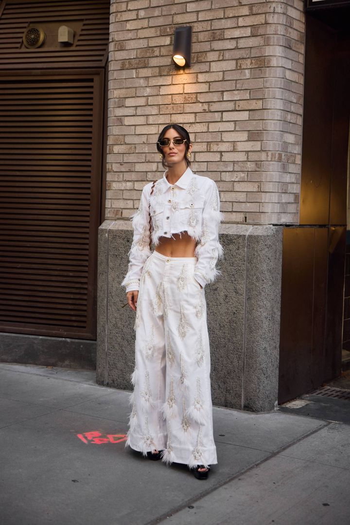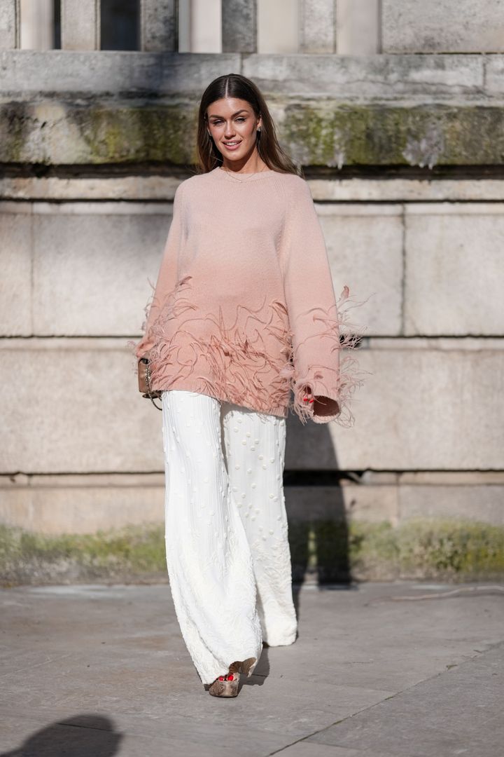 特別感のある素材で仕立てた白のワイドパンツに、フェザーのディテールが際立つブラウスを合わせて。仕上げにプラットフォームシューズを取り入れれば、華やかさと実用性を兼ね備えたフォーマルスタイルが完成する。今季らしさをプラスするなら、やわらかなパステルトーンを選ぶのが正解。淡く優しいカラーが、夏のムードにぴったりと馴染む。