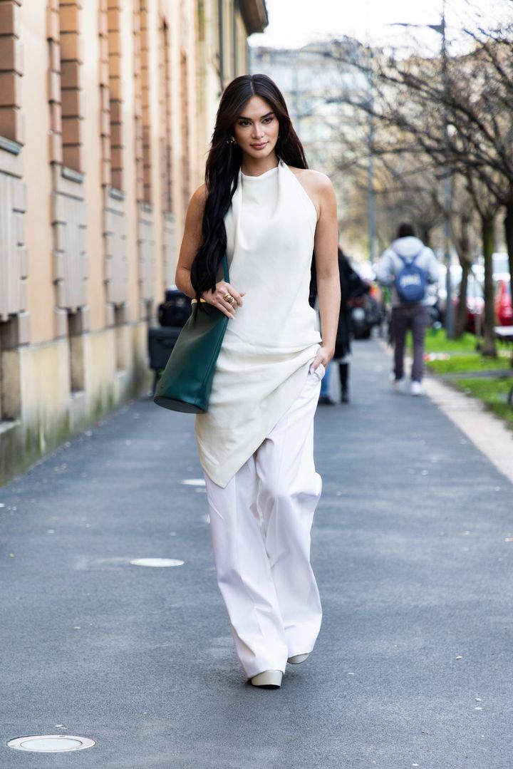 この夏注目を集めているのが、ドレス×ワイドパンツでつくる“ロング&リーン”なオールホワイトルック。なかでも、トレンドのパラッツォパンツをレイヤードしたスタイルは、新鮮さと大胆さを兼ね備えたモードな提案だ。洗練された印象に仕上げるには、ドレスのシルエット選びが鍵。ボリュームは控えめに、ドレープの効いたデザインやホルターネック、アシンメトリーなカットなど、縦ラインを強調できる一枚を選びたい。足もとは、パンツの丈感を美しく見せるプラットフォームシューズで高さをプラス。クリーンで都会的なバランスが完成する。