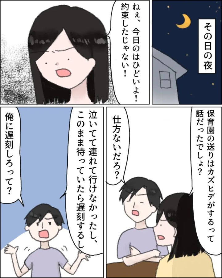 「ねぇ、今日のはひどいよ!約束したじゃない!保育園の送りはカズヒデがするって話だったでしょ?」カズヒデに詰め寄ると、「仕方ないだろ?泣いてて連れて行けなかったし、このまま待っていたら遅刻するし・・。俺に遅刻しろって?」と逆ギレし出すカズヒデに、