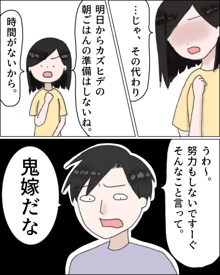 「・・じゃ、その代わり、明日からカズヒデの朝ごはんの準備はしないね。時間がないから」そう言うと、「うわ~。努力もしないですーぐそんなこと言って。鬼嫁だな」と言い出すカズヒデに、