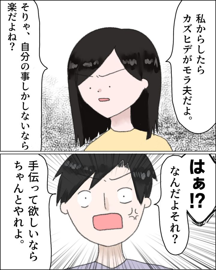 「私からしたらカズヒデがモラ夫だよ。そりゃ、自分の事しかしないなら楽だよね?」私の言葉に、「はぁ!?なんだよそれ?手伝って欲しいならちゃんとやれよ」とカズヒデが怒り出しました。