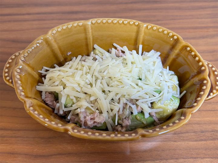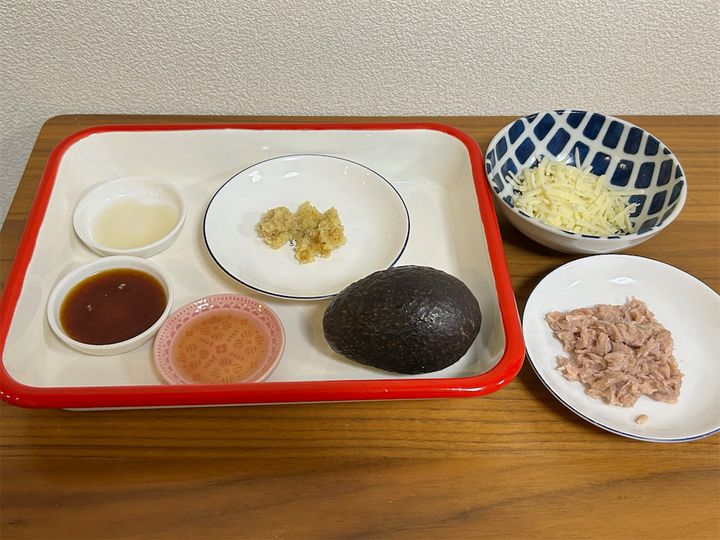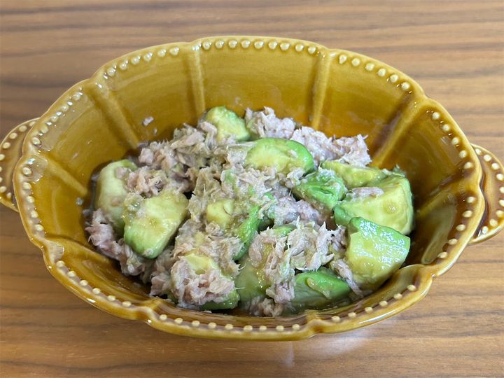 まず、先ほどの手順どおりに作った「アボカド漬け」を耐熱皿に移し、ツナを加えて混ぜ合わせます。