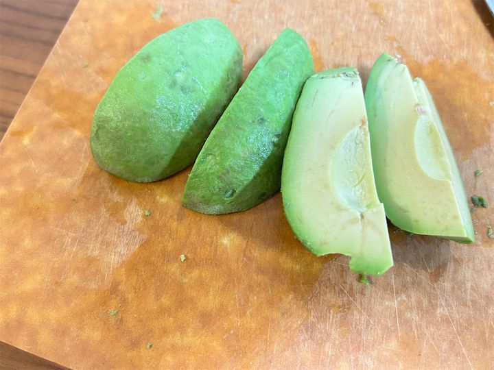 1.アボカドは種を取り、皮を剥いて縦4等分にカットします。