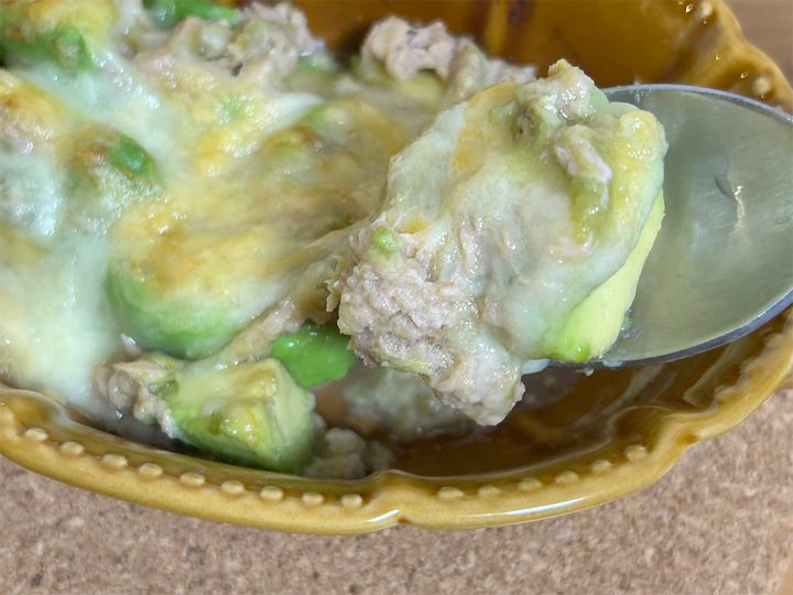普通に食べても十分おいしいのですが、動画の最後で馬場さんが紹介していたアレンジレシピ「焼きアボカド」も気になったので、後日作ってみることに。トースターで焼く、ツナチーズグラタンといった感じです。