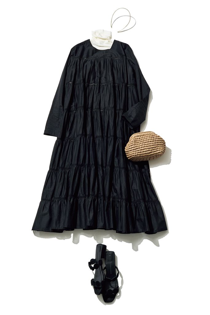 白タートルは着まわし。黒ワンピース/マーレット(LITTLE LEAGUE INC.) カチューシャ/Jennifer Ouellette(ZUTTOHOLIC) バッグ/NOAM HAZAN(ティースクエア プレスルーム) サンダル/TSURU By MARIKO OIKAWA