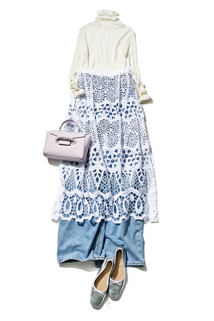 白タートルは着まわし。カットワークレーススカート/MATOKAMATOKA、バレエシューズ/SPELTA(ともにフラッパーズ) デニムパンツ/HAIKURE(ショールーム ロイト) バッグ/VASIC(ヴァジックジャパン)