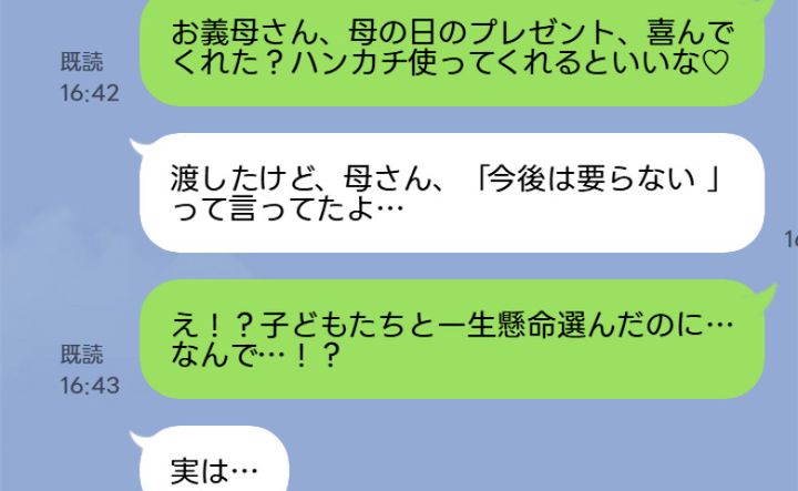 3. 「そんな…」子どもと選んだハンカチを義母にプレゼント。夫「今後は要らないって。実は…」ショッキングな義母の反応