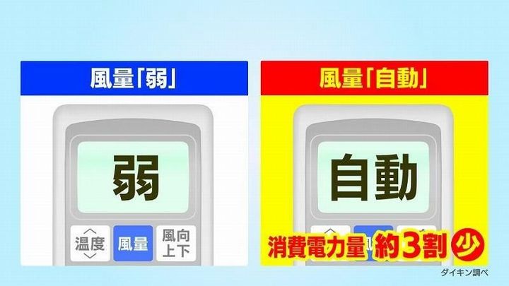 風の量を「弱」と「自動」にして日中の11時間つけっぱなしにしていた場合は、「自動」の方が消費電力量が3割ほど少なくなったということです。
