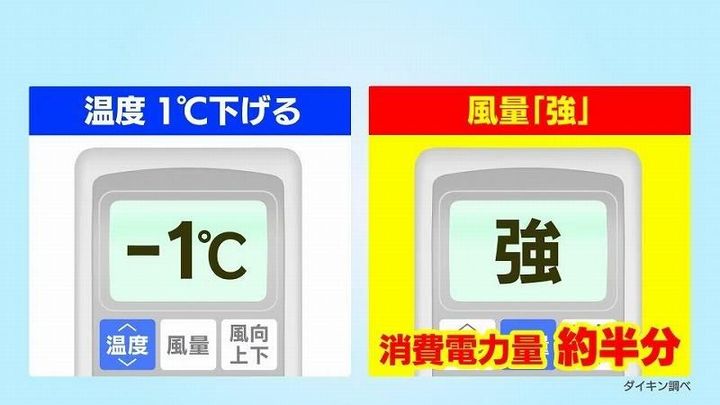 「強」にした場合は、設定温度を「1度下げた」時に比べ、消費電力量が約半分になったということです。
