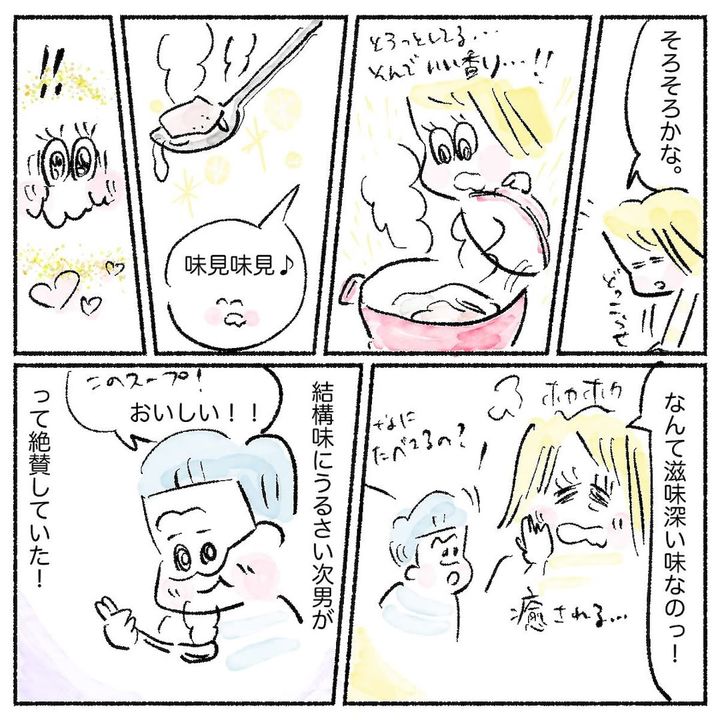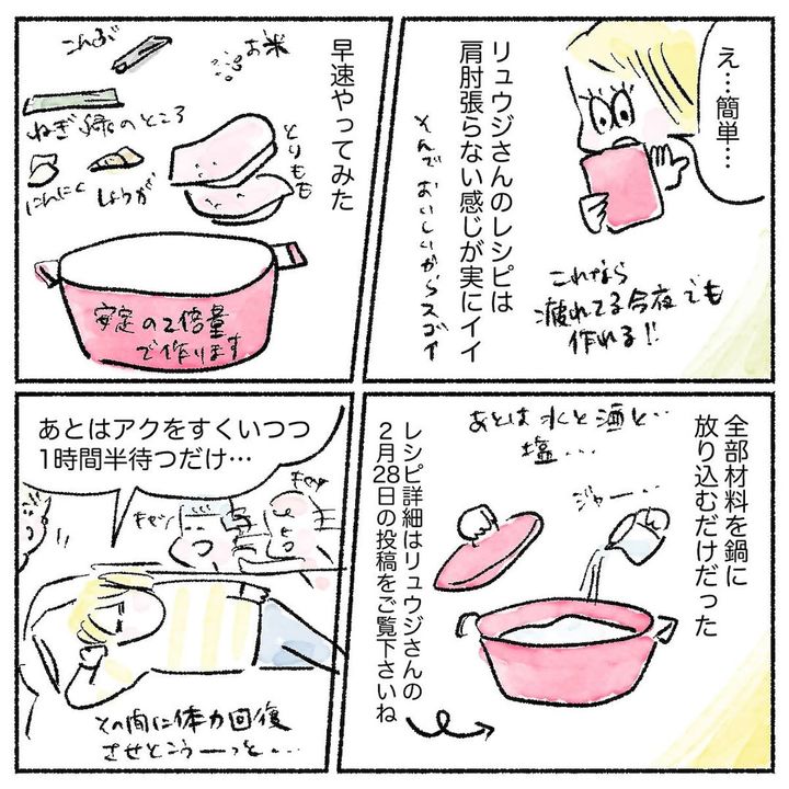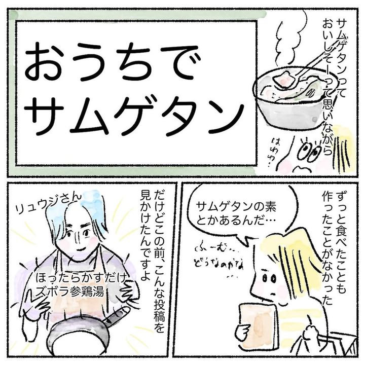こんにちは!4児の母で漫画家兼公認会計士のAyumiです。「サムゲタン」は、丸鶏を使った韓国発祥の伝統料理。高麗人参やナツメなどの漢方食材と一緒に鶏肉をホロホロに煮込みます。そんな手間暇かけた一品、当然おうちで作るなんてできないよね~と思っていたんですが、料理研究家・リュウジさんが手に入りやすい食材で簡単に作っている動画を発見!ほぼほったらかしなのに、滋味深~い味に仕上がりました!詳しくは漫画をご覧あれ♪