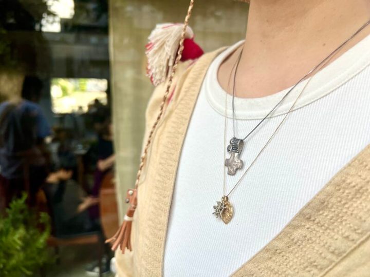 京都の帽子ブランド「アーナ」のストローハットを、自身の手がける「CO+10(コウテン)」のストラップでアレンジ。重ね付けしたペンダントチャームは、「CO+10(コウテン)」のクロスと、「chumeq(チュメック)」の蜘蛛の巣モチーフ。