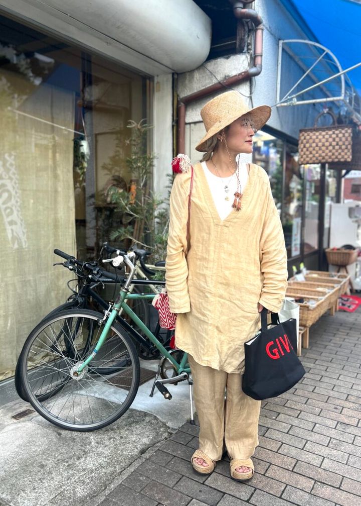 京都の街になじむ、ワントーンコーデ。harukoさんがさらりと着こなす大人世代のフォークロアスタイルは、アクセサリーが主役。大人世代のアクセサリーの選び方のポイントは、「歳を重ねると、断然、ボリュームアップするのがおすすめ」とか。「好きなものはずっと変わらないけど、そのままだとどうしても違和感がありますよね。意識して、きれいなものを選ぶようにしています」。