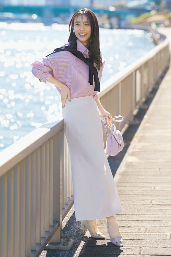 ストライプシャツがピンクをすっきりとした甘さに誘導。ペンシルスカートを合わせて、お仕事向きなきちんと感もプッシュして。